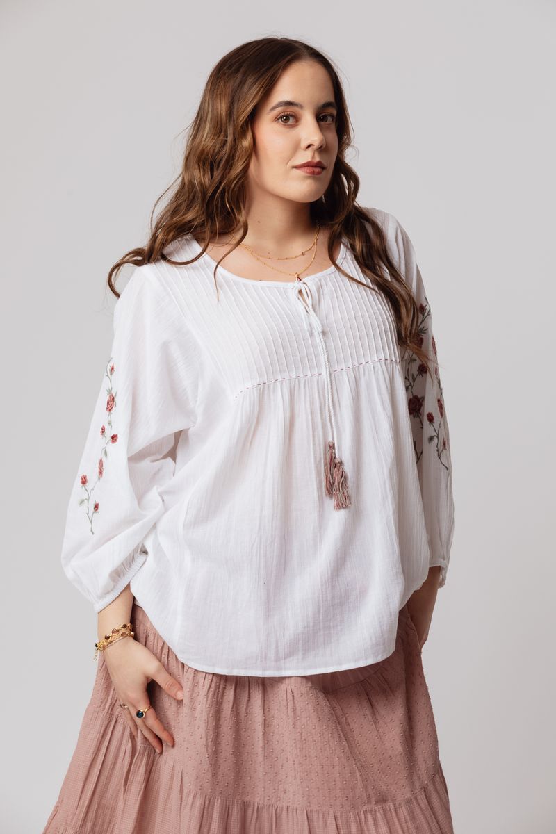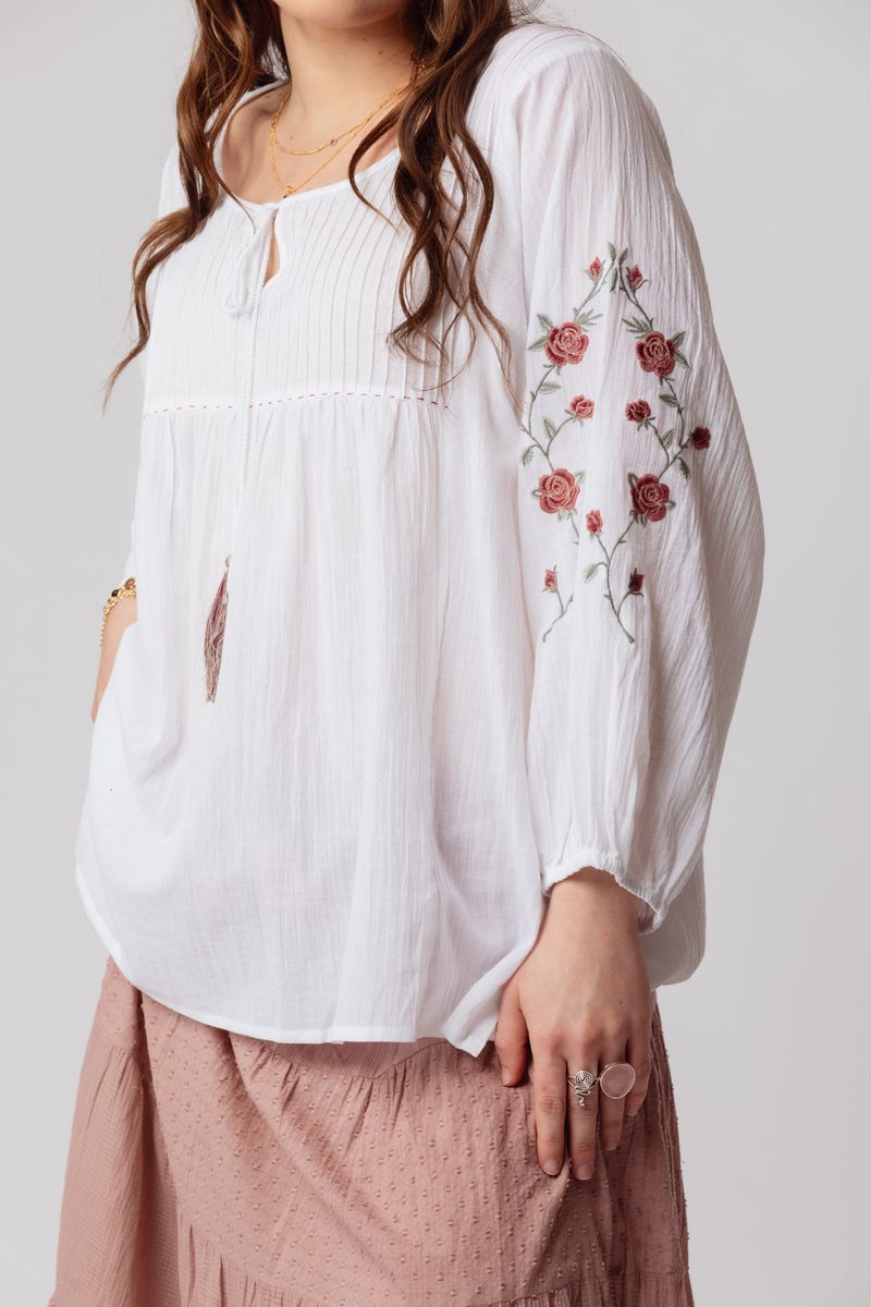 Our Jaya Top is a relaxed-fit style crafted from crisp white cotton fabric for effortless everyday wear. Featuring long sleeves and delicate floral embroidery, it’s finished with soft pleating across the bodice for gentle shape and texture. A tassel-end tie at the neckline adds a subtle bohemian detail, completing this timeless and easy-to-style piece.
